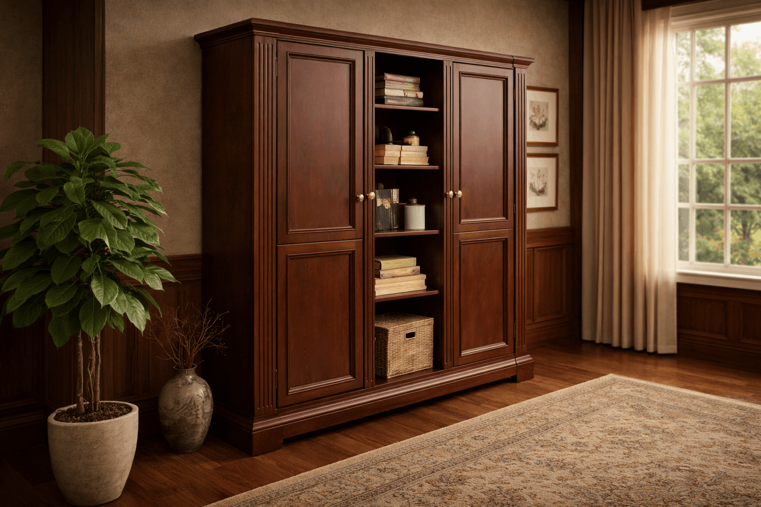 Elegant Solid Wood Storage Cabinet with spacious shelves and closed door storage.