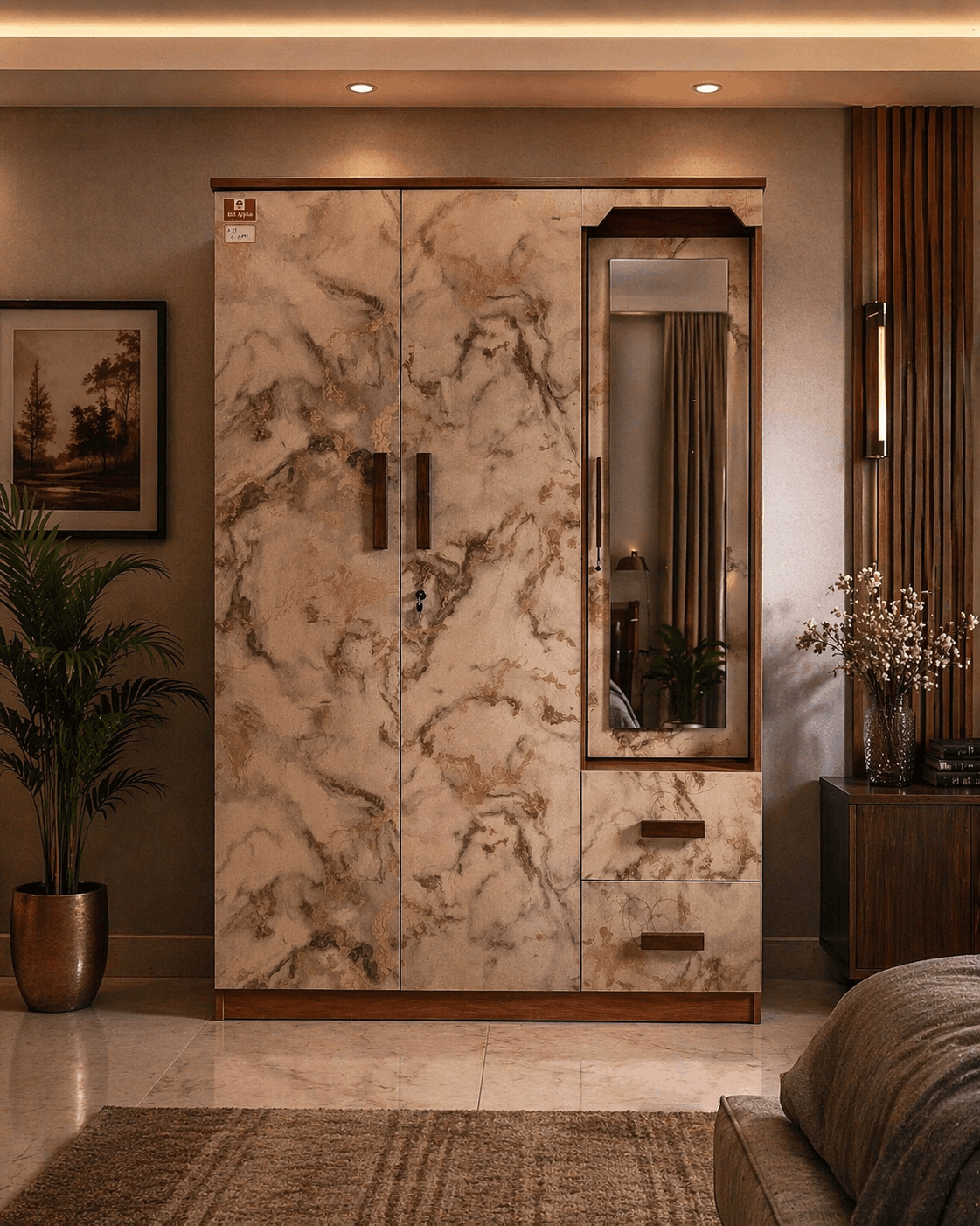 Premium Marble Finish Wardrobe with Mirror & Drawer Storage – Modern Bedroom Almirah