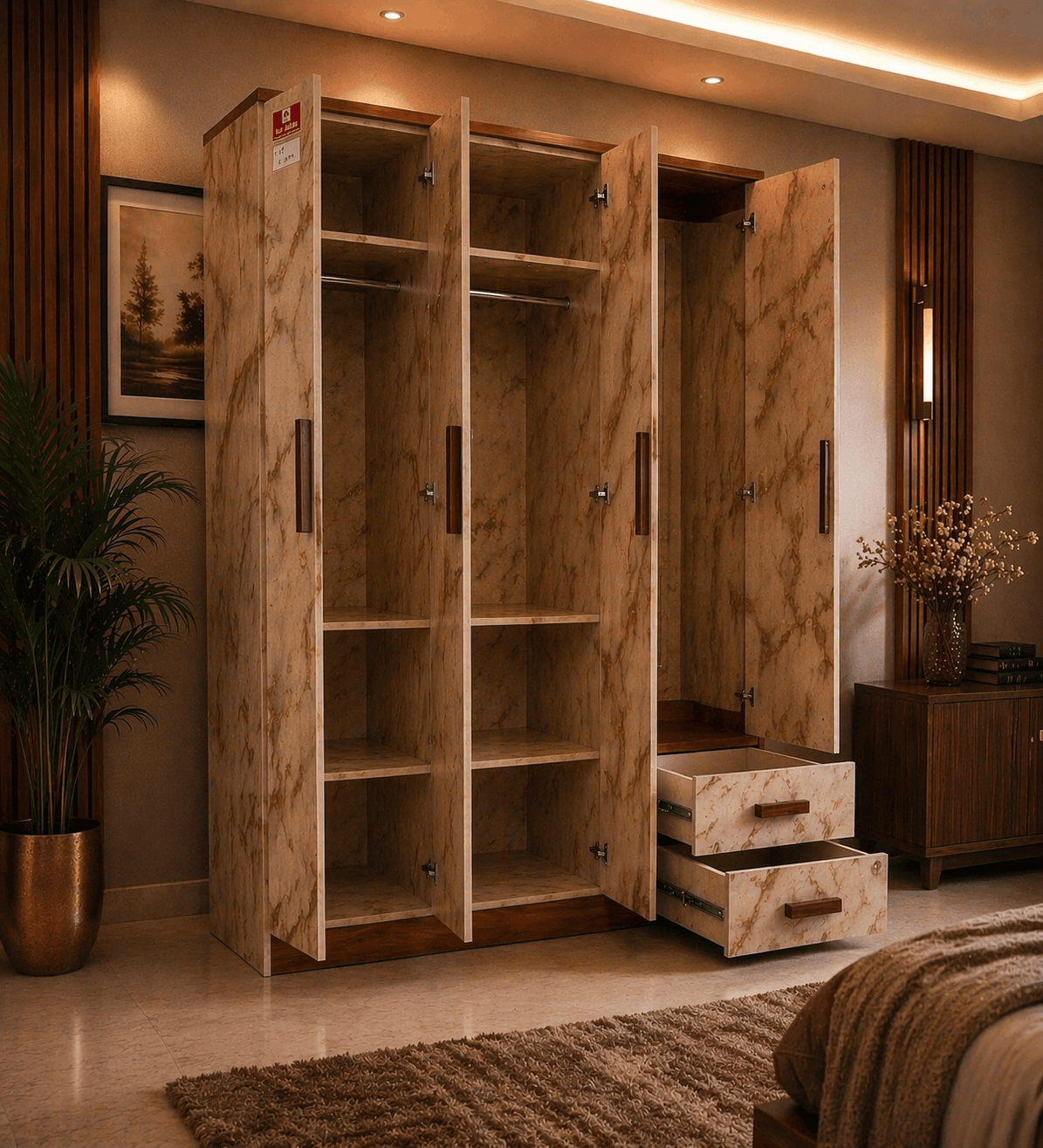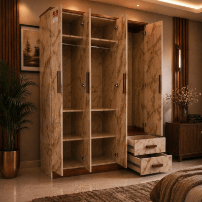 Bring a touch of luxury and practicality to your bedroom with this premium marble-finish wardrobe. Crafted with precision and modern design principles, this wardrobe not only enhances your interior aesthetics but also offers efficient storage solutions.